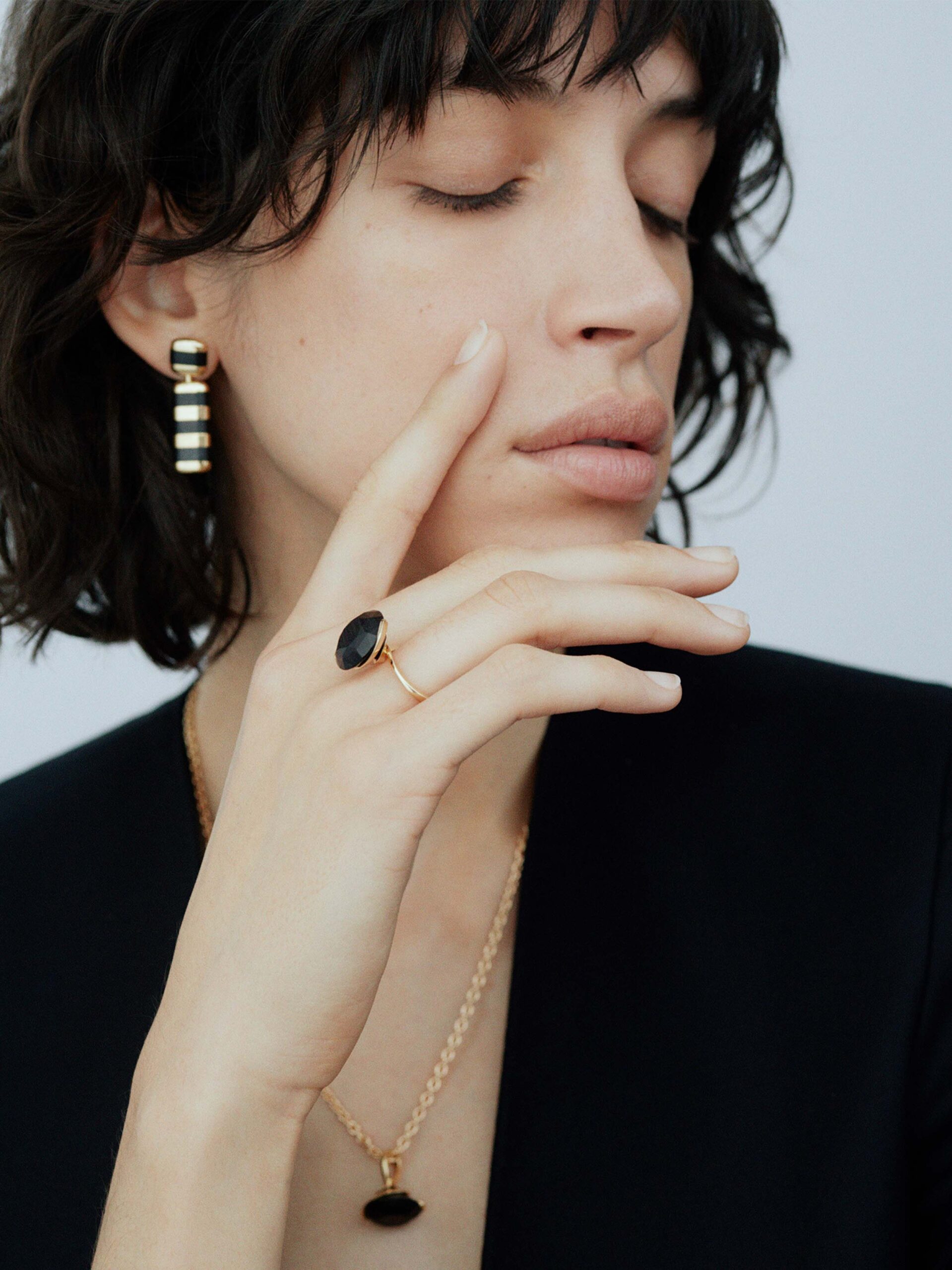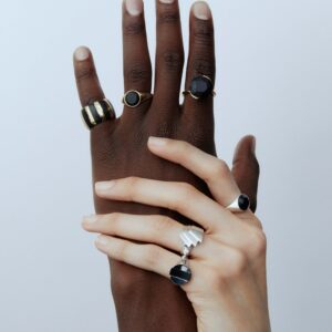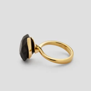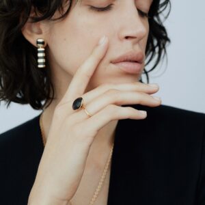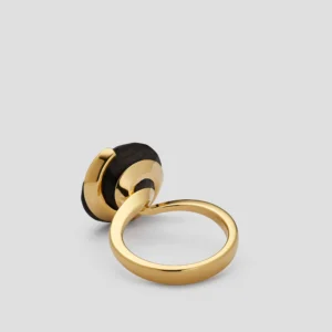 A graceful embrace, caught in motion. The Petal ring wraps recycled 18K gold around 7ct. brilliant-cut Mpingo blackwood, following its form with quiet precision. The gold curves with intention, embracing the wood’s deep surface in a gesture of counterbalance. Elegant in form, understated in presence, with an undercurrent of bold energy held perfectly in check.