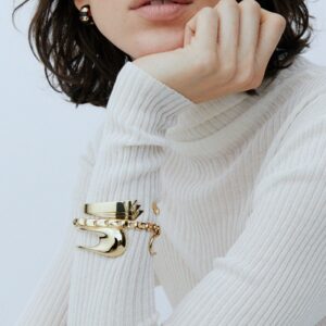 This exquisite bracelet is meticulously crafted from recycled 18 karat gold, showcasing the metal’s rich glow and lasting luxury. Drawing inspiration from Carlo Scarpa’s Tomba Brion, it reflects a perfect balance of architectural beauty and Danish design precision.
