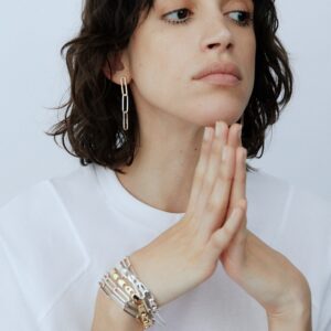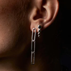 This outstanding link earring is handmade in solid recycled sterling in silver. The links are designed according to the ancient art of Japanese wood joinery – the links fit neatly together when still, but come softly alive in movement.